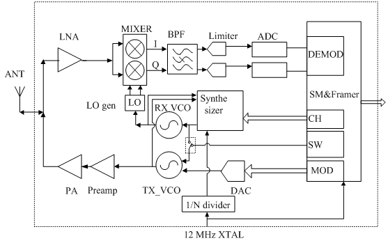 transmitter,receiver,frequency synthesizer GFSK and modulator-demodulator.